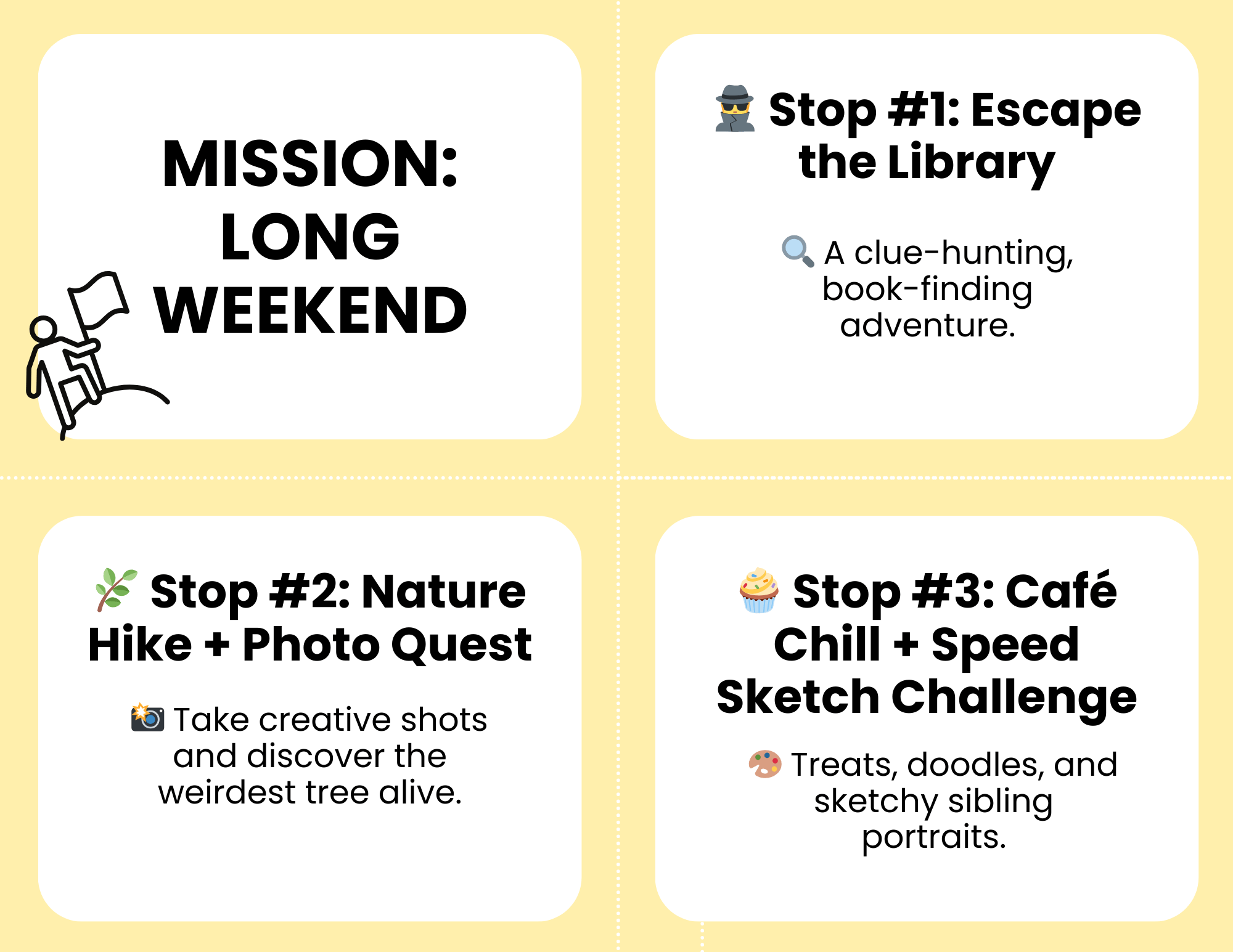 With 6 themed adventure cards (plus a title card), each stop includes a playful title and activity idea. From Escape the Library to Pickleball Showdown and a cozy Movie + Blanket Fort Takeover, this set offers a balance of creativity, movement, and chill time. Whether you’re filling a long weekend or just planning a screen-free Saturday, these cards make it easy to guide your day with laughs and connection.